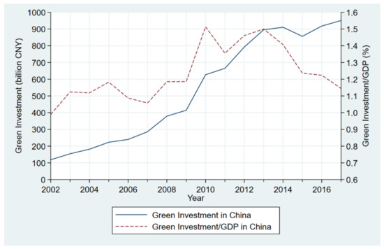 In China Statistical Yearbook in 2004, the China Bureau of Statistics gave a relatively complete definition and statistics of investment in anti-pollution projects for the first time. This definition has been used ever since. China Bureau of Statistics defines investment in anti-pollution projects as “fixed assets investment in the treatment of industrial pollution and in the construction of environment infrastructure facilities in cities and towns”. More specifically, investment in anti-pollution projects includes three types of investment: (i) investment in treatment of industrial pollution; (ii) environment protection investment in environment protection acceptance project in this year; (iii) investment in the construction of environment infrastructure facilities in cities and towns. The first two types, (i) and (ii), are related to industrial pollution, of which (i) in turn includes treatment of waste water, treatment of waste gas, treatment of solid waste, treatment of noise pollution and treatment of other pollution. The third type, (iii), includes gas supply, central heating, sewerage projects, gardening and greening, sanitation. The first two types, (i) and (ii), are green investments made by industrial firms. The third type (iii) is green investment from the government. Taking the data of 2017 as an example, the total green investment in China was 953.90 billion CNY. Among them, the first and second types of investment from industrial firms were 68.15 billion CNY, 277.17 billion CNY, respectively. The third type of green investment from the government was 608.57 billion CNY.