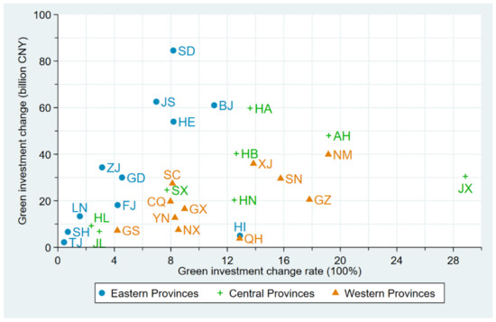 Figure 2 shows the rate of change and the amount of change in green investment for 30 provinces in China from 2002 to 2017 in horizontal and vertical coordinates, respectively, and we use three colors and symbols to distinguish between eastern, central, and western provinces. In terms of provincial green investment growth rates (horizontal coordinates), most provinces showed significant growth in green investment from 2002–2017. It is worth noting that 12 of the 30 provinces (40%) had more than 10 times green investment growth, and in particular, JX had green investment growth of 28.86 times, which was mainly due to the especially high priority given to environmental pollution control by the Chinese government during that period. Among the three regions, the green investment growth rates in central and western were significantly higher than those in eastern. More specifically, the provincial averages of green investment growth rates in the east, central and west during the period were 5.63 times, 12.48 times and 11.41 times, respectively. Both central and west had 5 provinces with green investment growth over 10 times, while only 2 provinces, out of 11, in the east showed such dramatic growth. It is noteworthy that 2 provinces, SH and TJ, in the east showed green investment growth less than 1 times with 0.71 and 0.44, respectively. In terms of the amount of provincial green investment growth (vertical coordinate), the amount of green investment growth in the east and central was significantly higher than that in the west from 2002–2017. The provincial average amount of green investment growth in the east, central, and west was 33.80 billion CNY, 29.94 billion CNY and 20.09 billion CNY, respectively. Many policies might have driven the changes, such as the central government strengthening the supervision of local environmental governance and paying attention to the environmental governance performance in the promotion of officials.