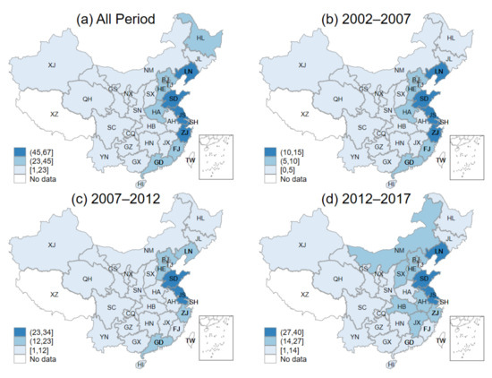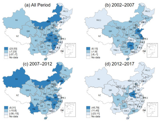 Provincial regional green investment allocation effect: (a) all periods; (b) 2002–2007; (c) 2007–2012; (d) 2012–2017.