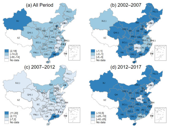 Figure 5b–d show the provincial RIA in the three periods of 2002–2007, 2007–2012, and 2012–2017, respectively. In general, the RIA in most of the provinces indicated a trend of “high-medium-high”. During the first period, 2002–2007, 21 provinces were with high RIA while, in the second stage, 2007–2012, 24 provinces could be categorized as low RIA, and GD was the only province with high RIA. Meanwhile, 5 provinces, NM, LN, SX, HA and SH, were with medium RIA. During the third period, 2013–2017, 27 provinces were with high RIA, except for LN, HA, and GD with low or medium RIA. The intervals of the trends in each time period were (−1, 1], [−7, 2], and (−10, 5], respectively. It suggested that the effect of RIA was weak in most of the provinces in these three periods.