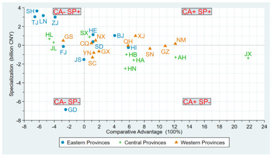 Given the fact that RIA is the product of Specialization (SP) and Comparative Advantage (CA), to further analyze RIA, we have created four quadrants with CA and SP for each province (see Figure 6). As stated in the methodology section, if a province is in the first quadrant or the third quadrant, meaning both CA and SP have the same sign, positive or negative, its RIA is positive. When a province is in the second quadrant or the fourth quadrant, meaning CA and SP have different sign, the RIA of the province is negative. In Figure 6, it is clear that most of the provinces were located in the second and fourth quadrants, suggesting the RIA of these provinces was negative. More specifically, in the 4 eastern provinces, SH, TJ, LN, and ZJ, although they had better green investment share than the entire country’s level, green investment growth was relatively disadvantageous, resulting in these 4 eastern provinces having negative RIA. For 16 central and western provinces, green investment growth was comparatively advantageous. However, only 5 of these 16 provinces had a high green investment share than the national level, resulting in positive RIA for these 5 provinces, leaving 11 central and western provinces with negative RIA.