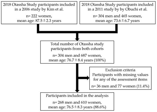 A flowchart detailing the design of this study is shown in Figure 1. There were 991 adults (100%) (304 men and 687 women, mean age: 76.7 ± 8.4 years) who visited the venue and participated in the comprehensive health examination. Among the visitors, 113 (11.4%) with missing survey data were excluded from the analysis. The total number of participants included in the study was 878 adults (88.6%) (268 men and 610 women, mean age: 76.5 ± 8.3 years).