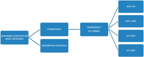 A structured questionnaire (Appendix A) for seafarers was composed about the perception and intensity of noise pollution in general and onboard ships. Noise analysis is combined with the top-down approach through the willingness to pay value (WTP), and alternatively, willingness to accept (WTA), multiplied by the number of noise-exposed persons to obtain average or total external noise costs [7,29]. Thus, the noise valorization is identified with the people’s motivation in how much they are willing to spend for implementing the measures that will reduce the noise and, alternatively, how much compensation they claim for noise tolerance. Awareness of the harmful effects of noise is of great importance for conducting such a survey. When awareness of the noise exposure detrimental effects is not sufficient, a credible response can be obtained indirectly using a hedonic pricing method (HP). The method enables estimating one’s attitudes towards noise pollution over his/her opinion on whether and to what extent noise affects own real estate prices and rental prices [7]. The present paper examined the seafarers’ willingness to participate in financing noise abatement (WTP) as a good indicator of what extent an individual attaches importance to the topic. The respondents’ objectivity was tested by questions about the need for a salary supplement due to noise exposure (WTA), perception of noise in own household, and noise impact on the own apartment value (HP). For the simple estimation of the noise intensity to which they are exposed, the respondents could use a decibel level comparison table attached in the questionnaire and choose the option. To some questions, respondents had to answer using the Likert scale. Data were processed using descriptive statistics. The correlation test (CORREL) and linear regression (LR) were used to determine the dependency between the size of monthly income (MI) and WTP as well as the requirement for a salary supplement due to noise impact (WTA) and WTP. The possible WTA and WTP values correlation with the estimations on the own apartment values loss due to noise (HP) were also determined. All calculations were made in spreadsheets. The methodological concept applied as sketched in Figure 1 aimed to objectify the consistency of the responses.