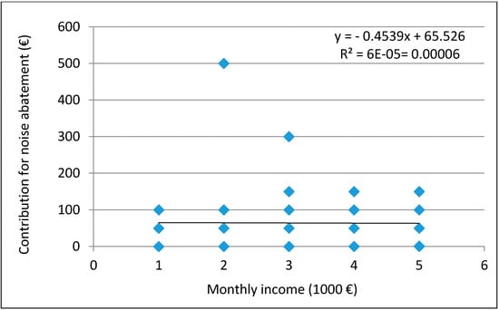 The surveyed seafarers indicated a willingness to pay an average of 65 € per year for noise mitigation. The dependence of the size of payments declared for noise mitigation on monthly incomes was examined by linear regression, as reported in Figure 3.