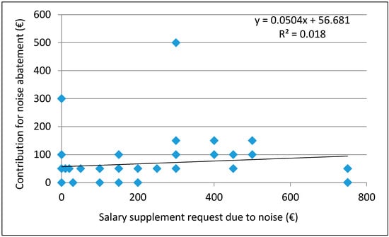 Furthermore, the dependence of the size of the payment declared for noise abatement on the request size for salary supplement due to noise was examined by linear regression as reported in Figure 4. Even this resulted not to be determined (R2 = 0.018). The correlation coefficient r = 0.13398 indicates a very weak positive correlation.