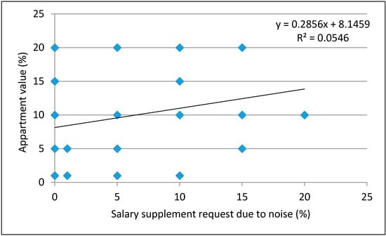 The dependence of attitudes about the noise impact on own apartment value on those about the salary supplement request due to noise at the workplace was examined by linear regression, as reported in Figure 5. The low coefficient of determination (R2 = 0.0546) indicates a minimal degree of dependence between the two groups of responses. The correlation value determined by the correlation test, r = 0.23363, shows a very weak positive correlation between the examined groups.