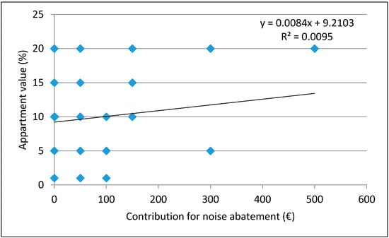 The same tests were used to find the dependence of attitudes towards the noise impact on the own apartment value on attitudes towards a voluntary contribution for noise abatement, as reported in Figure 6. The low coefficient of determination R2 = 0.0095 and a correlation coefficient r = 0.0973 are found, indicating the absence of dependence and correlation between the settings.