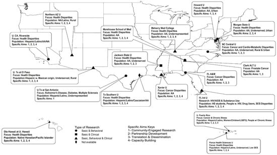 A total of 18 of the 25 formerly or currently-funded RCMIs responded, including institutions spanning 13 states and territories (Figure 1). As shown in the map, nine (50%) of the RCMIs supported basic, clinical, and behavioral research projects, while six (33%) supported basic and behavioral only, and two supported basic and clinical only. Responding RCMIs were serving a variety of underserved populations, including African Americans, Hispanic and Latino communities, Native Hawaiians and Pacific Islanders, and other minority groups in both rural and urban settings.