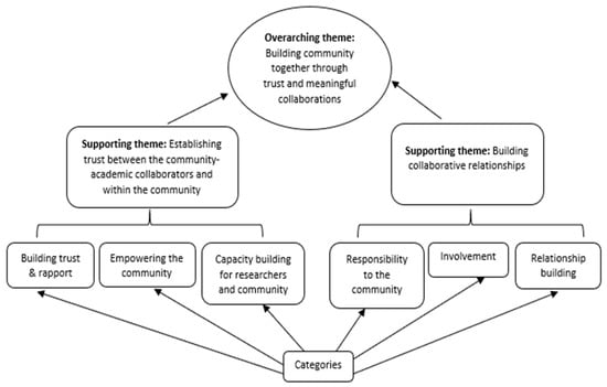 Analysis of findings from the four open-ended questions led to the emergence of two supporting themes [24]. These included: (1) establishing trust between the community-academic collaborators and within the community and (2) building collaborative relationships. Each of these supporting themes, along with relevant subthemes, is described and illustrated with sample quotes from CEC leaders’ responses to the open-ended questions. An overarching theme, building community together through trust and meaningful collaborations, emerged from the supporting themes and subthemes, representing the highest level of abstraction from the data (Figure 2) [23,24].