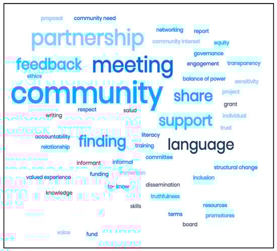 The word cloud in Figure 3 captures many of the concepts derived from our findings that are crucial to the work we do collaboratively within our communities. The most frequently mentioned words in the qualitative findings appear largest in the cloud, and include community, partnership, meeting, language, feedback, support, share, and finding. The prominence of these words reflects respondents’ views that community and partnership must be central to all community engaged endeavors, that meetings (which take time) are essential for sharing and feedback, and that the community must be supported and see that researchers hear their voices.