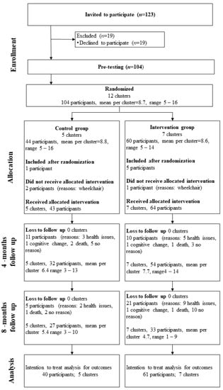 - Campbell, M.K.; Piaggio, G.; Elbourne, D.R.; Altman, D.G. Consort 2010 statement: Extension to cluster randomised trials. BMJ (Clin. Res. Ed.) 2012, 345, e5661. [Google Scholar] [CrossRef] [Green Version]