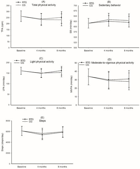- Meijer, E.P.; Westerterp, K.R.; Verstappen, F.T. Effect of exercise training on total daily physical activity in elderly humans. Eur. J. Appl. Physiol. Occup. Physiol. 1999, 80, 16–21. [Google Scholar] [CrossRef]