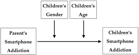 In previous studies, factors influencing smartphone addiction in children and adolescents were studied in relation to the individual’s personality, disposition, and psychological factors [31,32,33,34], and regarding parental factors, the parenting attitudes of parents were mostly studied [35,36]. There are studies confirming the direct relationship between parents’ smartphone addiction and their children’s smartphone addiction, but they have mainly been focused on infants and toddlers [37,38]. Thus, this study aims to examine the effects of parents’ smartphone addiction on smartphone addiction among school-aged children and adolescents and to verify the moderating effects of children’s and adolescents’ gender and age.