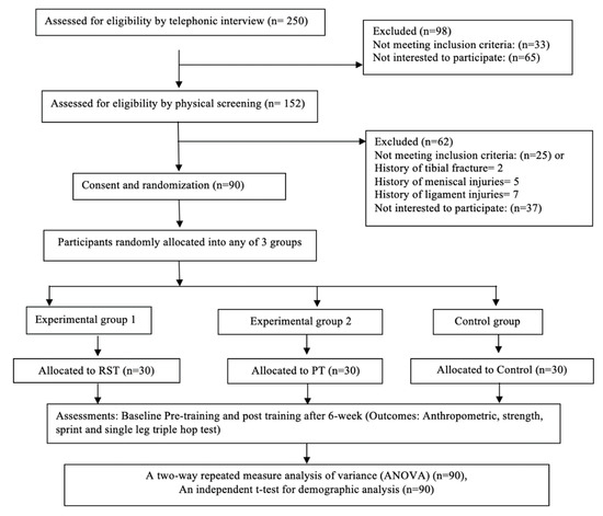 Consolidated Standards of Reporting Trials (CONSORT) diagram showing the flow of participants through each stage of a randomized trial. RST: resisted sprint Training, PT: plyometric Training.
