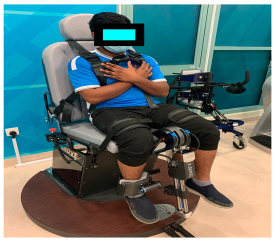 The isometric strength of the quadriceps femoris was measured using a reliable and valid ISOMOVE dynamometer (ISO-MANSW-IT, Tecnobody, Dalmine (BG) Italy). The ISOMOVE system, software version 0.0.1 (ISO-MANSW-IT, Tecnobody) was used to record all isometric data. It provided an accurate assessment of the maximum peak torque of the quadriceps muscles. All the subjects were familiarized with the equipment before the commencement of data collection. Participants were in the sitting position and were stabilized with safety belts across the chest, thighs, and hips to avoid displacements, and the shin pad was adjusted at 5.1 cm (2 inch) superior to the medial malleolus (Figure 2). All the measurements were recorded from the participant’s dominant leg, with the hip and knee angles set at 90 degrees of flexion, as this position results in the most significant torque output [23]. Verbal instruction was given to each participant to keep his/her arm crossed over his/her chest and the participant was given verbal encouragement to motivate them to attain maximum effort during the 5 s contractions. Each test included three consecutive 5 s trials with a 2 min rest between the trials. The mean score of three readings was used for statistical analysis.