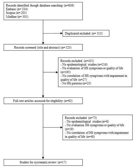 The literature search identified 836 references, 523 after removing duplicated papers. After reviewing the title and abstract, 92 records underwent full-text review. A total of 75 records were excluded because they did not investigate the impact of HS symptoms on QoL. Other reasons for exclusion along with the flow chart are shown in Figure 1. Finally, 17 studies, representing 4929 patients with HS, met the eligible criteria and were included and fully reviewed [24,25,26,27,28,29,30,31,32,33,34,35,36,37,38,39,40].