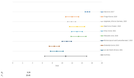 The HS signs and symptoms assessed were pain, pruritus, malodour and suppuration. Overall, the higher intensity of a sign or symptom correlated with poorer general QoL or specific QoL dimensions including sexual distress, anxiety, depression and sleep. The most frequently employed tool to assess QoL was the DLQI. DLQI was used in 52.9% of the studies (9/17) with a mean value of 10.70 (2.16 SD) after conducting a random effect meta-analysis weighted by the study sample size (Figure 2).