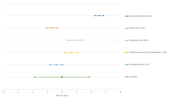 The incidence of pain was reported in two studies, ranging from 65.24% [33] to 77.5% [32]. NRS was the scale most used to assess pain (53.85%, 7/13) [24,25,30,31,32,33,34]. The mean NRS value was 3.99 (SD 0.95) after conducting a random effect meta-analysis weighted by the study sample size (Figure 3). VAS was the second most employed tool for pain but was scored in different ways [26,27,29,32,35]. PainDETECT [27], boil-associated pain score [28] and self-reported number of painful lesions [36] were other ways of pain severity assessment.