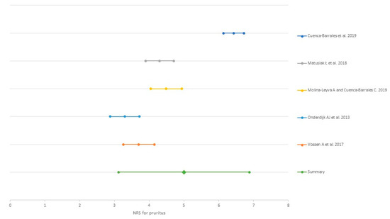 The incidence of pruritus was reported in three studies (41.7% [32] vs. 57.3% [40] vs. 61.8% [33]). The NRS for pruritus was the scale most used to assess pruritus severity [24,25,32,33,34,39,40]. The mean NRS was 4.99 (0.96 SD), after conducting a random effect meta-analysis weighted by the study sample size, Figure 4. VAS for pruritus [29], 4-item itch questionnaire [32] and 5-D itch scale [40].