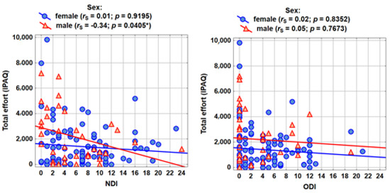 The correlation analysis was carried out according to the formulated research problems (Table 4). The Spearman’s rank correlation coefficient with the assessment of statistical significance (p < 0.05) was shown in the tables. The table shows the Spearman’s rank correlation coefficients between the severity of pain and physical activity (IPAQ measures). No significant correlations were observed in the group of women, while among men there is a statistically significant (for the measure of total activity) and close to statistically significant (for the partial measures of activity) relationship with NDI. The higher the pain in the cervical area, the slightly lower the physical activity (the correlations are not strong; the absolute value of rS is approximately 0.30).