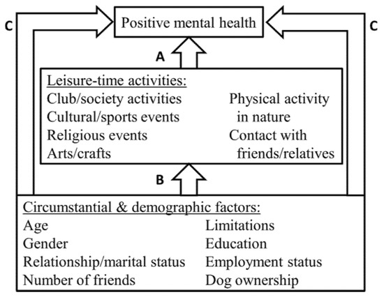 - Which circumstantial factors are associated with positive mental health of people living alone directly (C), indirectly via leisure activities (A × B), or as their combination (C + A × B)?