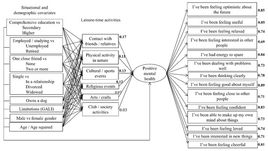 Illustration of the main reported structural equation model (n = 801) where positive mental health is specified as a latent factor whose loadings (reflecting correlation between the factor and the items) are shown at the right side of each item. The residual correlations between the leisure-time activities and the path estimates from each situational and demographic covariate to each leisure-time activity and positive mental health were estimated but they are not shown for clarity (provided in Table 2, Figure 3, and Appendix A Table A2). In bold: the 95% CI of the standardised estimate does not overlap with 0.
