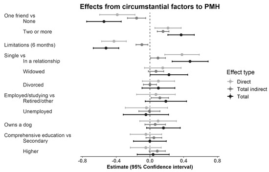 The abovementioned direct and total indirect connections from circumstantial factors to positive mental health were without exceptions to the same direction (Figure 3), and therefore their combinations, that is, total effects, were also to the same direction (see Appendix A Table A2 for the exact estimates). The strongest circumstantial correlates of positive mental health were having no friends (compared with one) or limiting illnesses in the past six months and having a significant other (being in a relationship, married or cohabiting). The absolute values of their estimates were larger than those of other forms of marital status (widowed or divorced vs. single), education (both levels), unemployment (vs. employment/studentship), and dog ownership (Appendix A Table A3).