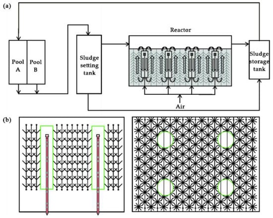 Figure 1 shows a schematic diagram of the ALBR system. The ALBR features (Figure 1a) an internal loop aerobic biofilm reactor. The volume of the ALBR is 4 m3, and its size is 2.2 m × 1.2 m × 1.2 m. Air for the aeration of the ALBR is taken from the purified compressed air in the plant, and the air pressure is 0.2 MPa. The inlet flow is regulated by a gas-pressure-reducing valve and glass air rotameter. Valves are installed on each branch of the inlet pipeline to ensure uniform flow in the aeration heads. The elastic solid filler (Figure 1b) is made of polymer and added with an antioxidant, hydrophilic agent, stabilizer, adsorbent, and other additives. The length of the filler is 1400 mm, and the radius of the fibers is 80 mm.