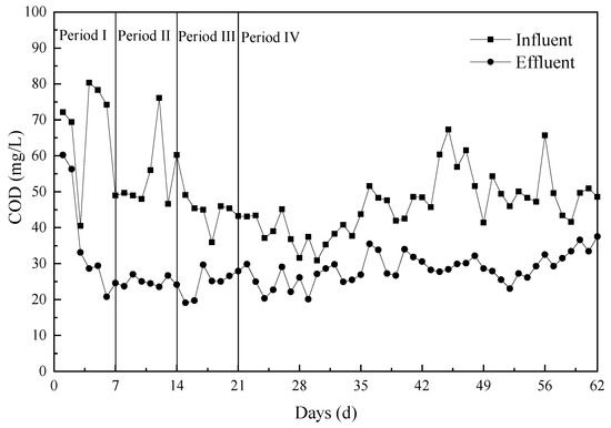 Period III (15–21 d): (HRT = 20 h) The initial wastewater influent was 200 L/h, and the HRT was 20 h. After 7 d of operation with an HRT of 20 h, the average influent COD was 44.3 ± 4.1 mg/L and the average effluent COD was 24.7 ± 3.97 mg/L.