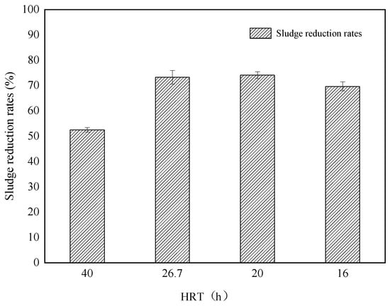 Sludge reduction rates are an index of the average sludge reduction effect. The reduction rates of the ALBR are related to the amount of sludge in and out of the system, the biomass produced by COD removal, the amount of sludge discharged from the secondary sedimentation tank, and the amount of sludge discharged from the bottom of the reactor. Addition of function-enhanced microbes to the ALBR could reduce sludge by over 50% under different HRT conditions (Figure 3). The sludge reduction rates increased with increasing HRT. When HRTs of 16, 20, 26.7, and 40 h were applied, sludge reduction rates of 69.64%, 74.09%, 73.24%, and 52.49% were obtained, respectively. As the HRT decreased, water inflow increased, the contents of suspended solids and dissolved organic matter increased, and the sludge reduction rates decreased. When the HRT was 40 h, the sludge reduction rates were 52.49%, likely because of the start-up reaction. At this stage, sludge depositions at the bottom of the reactor and secondary sedimentation tank were observed, leading to low calculation results. The laboratory-scale results [15] of the addition of functional microbes showed that the MLSS removal of sludge could reach 56.2% after 7 d of continuous operation, and the MLSS was measured to evaluate the effect of sludge reduction. Comparison of the present findings with laboratory results could confirm that the feasibility of using the ALBR with added functional microbes could be confirmed.
