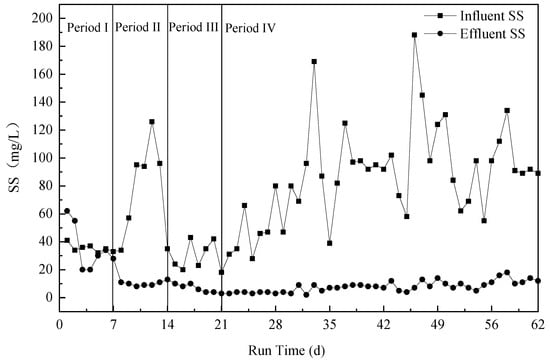 Because of the remarkable change in sludge settling performance in the A2O process in the sewage treatment plant, the SS concentration in the ALBR influent revealed notable changes (Figure 4). The ALBR may be likened to a biofilter reactor that intercepts the sludge carried by the influent and digests it to obtain the necessary nutrients. Therefore, the SS of the effluent was relatively stable and remained below 10 mg/L.