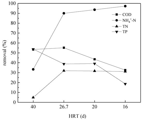 - The removal rate of COD and TN decreased with decreasing HRT, while the removal rate of NH4+-N increased. The removal rate of TP was approximately 30%.