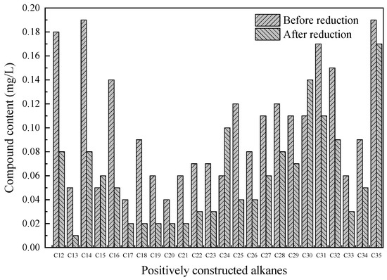 The oil components before and after reduction were analyzed (Figure 6 and Figure 7). GC-MS demonstrated that the main organic matter in excess sludge are n-alkanes. Because the oily components in the excess sludge mainly come from petroleum, the product of the GC-MS peak area percentage and oil content could be used to express the contents of linear alkanes. Significant changes in the distribution characteristics of petroleum hydrocarbons during excess sludge reduction were observed (Figure 6). In particular, the contents of n-alkanes decreased significantly. From carbon 12 to carbon 35, the lower is the carbon number, the easier it is to degrade. Organic compounds with low molecular weights and simple structures can easily be degraded. The yeast used in this study was mainly composed of Candida and Rhodotorula, which can oxidize C9–C25 n-alkanes and be used as a carbon source for growth. GC-MS analysis found that it also contains phenols, alcohols, ketones, esters, and other compounds, mainly benzene ring compounds, and it changes before and after reduction (Figure 7). The contents of linear alkanes remarkably decreased, but other compounds were hardly degraded (Figure 7). Alkanes, which feature simple molecular structures, are relatively easy to degrade. After the introduction of functional microbes, the sludge could be reduced, and the petroleum hydrocarbons in the sludge could be degraded simultaneously.