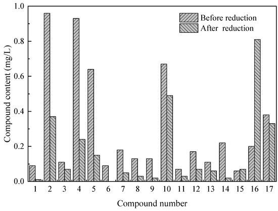 Contents of certain compounds (listed below) before and after reduction (1—C8H10; 2—C6H4Cl2; 3—C8H8O; 4—C2Cl6; 5—C8H10O; 6—C10H8; 7—C9H12O; 8—C7H5NS; 9—C9H12O; 10—C10H14; 11—C14H20O2; 12—C14H26O2; 13—C16H22O4; 14—C15H25N; 15—C16H23N; 16—C18H35NO; 17—C23H32O2).