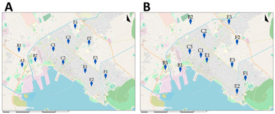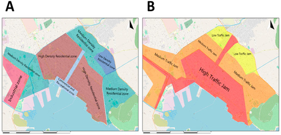 More specifically, the city of Volos was divided into five functional zones (commercial and recreational zone, high-density residential zone, medium density residential zone, low-density residential zone, and industrial zone) (Figure 2A). The traffic flow of the city was divided into three types according to the density of traffic (high, medium, and low traffic jams), as shown in Figure 2B.