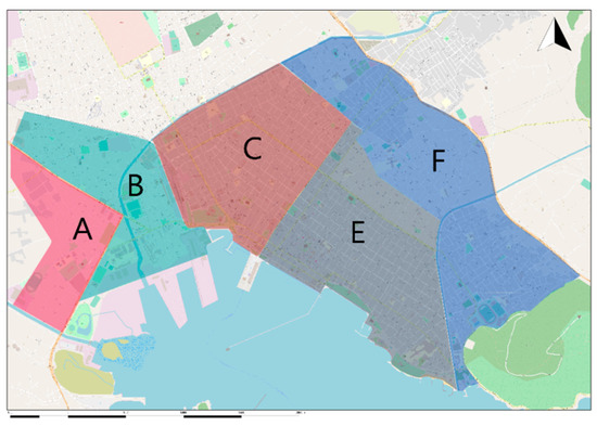 The city was divided into smaller areas and determined the number of sensors of each area as shown in Figure 3. The 1st industrial zone of Volos is located outside the city to the western suburbs, about 6 km from the center. The Lafarge Cement Volos Plant and the ELINOIL Petroleum company are located outside the city to the eastern suburbs, about 3.5 km from the center of the city. The city’s primary sources of heating are oil, natural gas, and fireplaces. The geographical location and the geomorphological features specific to the city were also analyzed.