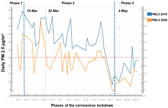 The trend of PM2.5 concentration in the city of Volos, Central Greece, from 7 March to 16 May 2020, compared to PM2.5 concentrations during the same period in 2019. The horizontal red dashed line identifies the PM2.5 concentration at 25 μg/m3 set as a safe limit by the World Health Organization air quality guidelines. The dotted dash vertical lines indicate the start of each phase of the three-step approach to combat the COVID-19 wave. Phase 1 (pre-lockdown period): 7 March–9 March, Phase 2 (lockdown period): 10 March–4 May, and Phase 3 (post-lockdown period): 5 May–16 May. The vertical black dashed line represents the initiation of the strictest period amid phase 2 (23 March 2020).