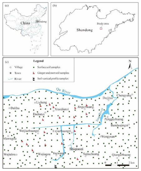 Geochemical data of soil and ginger used in the present study were provided by the Fourth Geological Brigade of Shandong Provincial Bureau of Geology and Mineral Resources. The sampling site is located in the ginger-planting area of the Jing River Basin in Shandong Province. The land-use type is mainly cultivated land, with problems such as excessive irrigation. In addition, the development of machinery foundry, building materials, and other enterprises in the study area has improved the economic performance, but also significantly increased the amount of sewage discharge. This led to an increase in the content of heavy metals, some of which may have accumulated in crops, such as ginger.