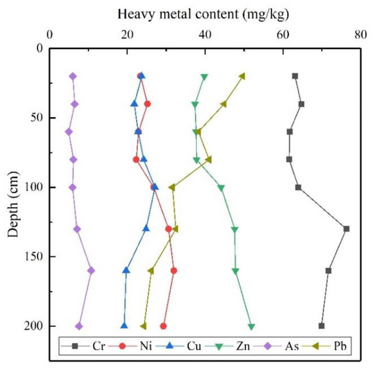Many studies [31,32,33,34,35] have shown that metals such as Pb, Zn, and Cd can accumulate in the soil plowing layer and migrate vertically. In Figure 2, the contents of As and Cu showed little change with increasing depth. The contents of Cr, Ni, and Zn showed little change within a depth range of 0–80 cm, below which they tended to increase with depth, indicating the influence of the parent materials of soil. The content of Pb was concentrated in the surface layer of soil and decreased sharply from top to bottom, suggesting that it is mainly controlled by external environmental and anthropogenic factors.