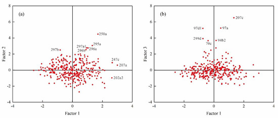 Scatter diagram of FA: (a) Factor 1 vs. Factor 2; (b) Factor 1 vs. Factor 3.
