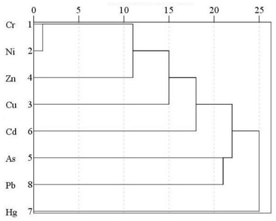 To further reveal the correlation between heavy metals, HCA was conducted on eight heavy metal elements in soil. The results are shown in Figure 4. Based on the results, the eight heavy metals can be divided into three clusters at a rescaled distance of 22. Cr, Ni, Cu, Zn, and Cd belong to cluster 1, Pb and As belong to cluster 2, and Hg belongs to cluster 3. This classification is basically consistent with the FA results.