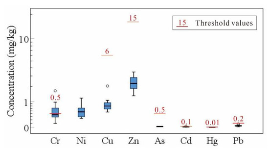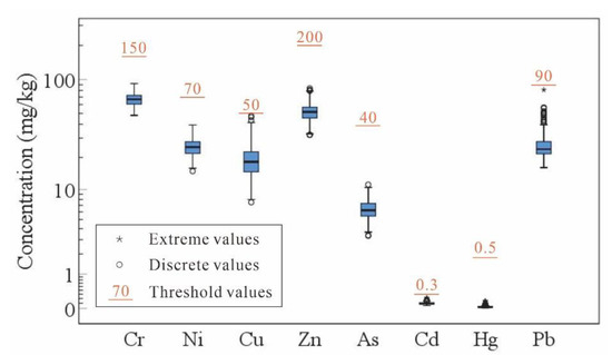 All samples were sent to the Experimental Testing Center of the Fourth Geological Brigade of Shandong Provincial Bureau of Geology and Mineral Resources for testing. Heavy metals were determined according to the Specification of Multi-purpose Regional Geochemical Survey (1:250,000) (DZ/T 0258-2014), Specification of Regional Ecogeochemistry Assessment (DZ/T 0289-2015), Technical Requirements for Analysis of Ecological Geochemical Evaluation Samples (Trial), and the Specification of Testing Quality Management for Geological Laboratories (DZ/T 0130.4-2006). For Cd analysis, samples were dissolved in HF, HNO3, and HClO4 to catch fluorine, and extracted with HNO3; the volume was metered and Cd was then determined by inductively coupled plasma mass spectrometry (ICP-MS). For Cu, Pb, Zn, Ni, and Cr, samples were processed using the powder pressure method and tested by X-ray fluorescence spectrometry (XRF). For As and Hg, samples were pretreated with aqua regia and tested by atomic fluorescence spectrometry (AFS). For pH, samples were immersed in distilled water without carbon dioxide and tested using the ion selective electrode (ISE) method.