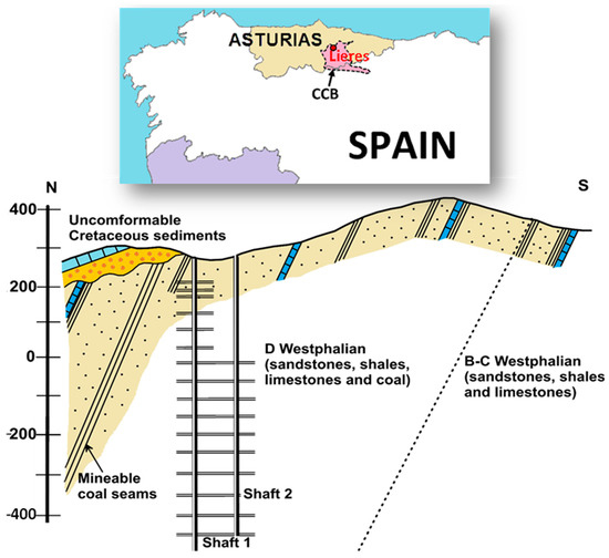 The CCB is one of the units into which the Cantabrian Zone, in the north of the Iberian Massif, has been classically divided [31]. The CCB comprises a very thick sequence of siliciclastic rocks (paralic), which includes subordinated limestones, from Namurian to Westpahalian D in age. Locally, the coal-bearing succession found in the surroundings of the Lieres mine belongs to the upper series (“Sama Group”) and it is mainly constituted of lutites, but also sandstones (litharenites) and coal seams, as well as Carboniferous limestone thin levels (near the boundary between Westphalian C and D), forming a fan-delta cycle. The coal extracted in the Lieres mines is of the bituminous-C type following the ISO 11760 classification, and the whole series lies within the diagenetic domain, with a vitrinite reflectance of between 0.6% and 1% [32]. The thickness of the coal seams varies between 0.5 m and 2.5 m. Overlying this Carboniferous basement, to the north of the Lieres mine shaft, there is a Cretaceous homoclinal structure, which is constituted by Albian sandstones and microconglomerates, followed by a group of Cenomanian limestones, marls and sandstones (Figure 1).