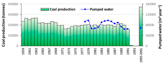 The coal was extracted by hand, by means of pneumatic hammers in a longwall with the form of inverted stairs, with timber support and backfill, a method used for subvertical (>45°) coal seams. An average of 200,000 tons of coal per year were extracted from the mine (Figure 2) totaling more than 7 million tons (data obtained from HUNOSA and the historical archives). Considering the coal density (1.8 t·m−3) and that the residual void is 40% of that occupied originally by the coal, a total volume of 1.6 Mm3 was left as empty space. Moreover, according to the HUNOSA records, the galleries in the Lieres mine have a total length of 242 km; assuming a midsection of 10 m2 for those galleries, they suppose a void volume of 2.4 Mm3. Thus, the total volume of the voids in the mine is more than 7 Mm3. This figure was underestimated in previous studies, such as in [13], that did not take into account all the coal mined at the mine. The average pumped flow when the mine was dewatered was around 80,000 m3 year−1 = 2.5 L·s−1 (Figure 2). Step pumping was established to lift the water 780 m; there were three pump rooms in the galleries at depths of 290, 600, and 660 m, with a capacity of 500, 630, and 150 m3, respectively. The total pumping power was 1400 kW. This pumping was stopped after the mine closure and now the mine is being flooded.