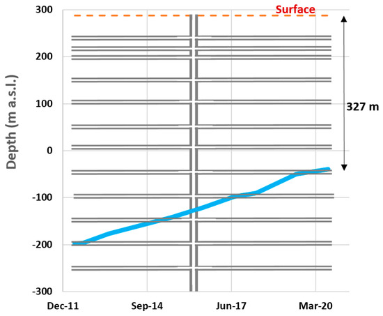 From a hydrogeological point of view, CCB Westphalian series have low permeability; no significant aquifers have been defined and the water that the mine receives comes from rainfall infiltration on the related basin. In particular, the Lieres mine is popularly known as a “dry mine” on a regional scale, as the recharge received by infiltration is much lower than in other mines in the CCB. This low recharge is principally due to the absence of mine workings at depths below 60 m from the surface. This prevents mining-induced fractures from reaching the surface and promoting infiltration, unlike other mines in the CCB, which tend to receive more infiltration even from losing streams [26]. Figure 3 shows the water level rise during the flooding of the mine. The mine is currently flooded to a depth of 320 m from the surface and the water level rises very slowly, with an average rate of 19 m per year. The rise in the water level is logically dependent on precipitation; however, water rises more slowly as it reaches the mine levels (greater volume of open galleries to fill) and more quickly between mine levels. Flooding was faster initially, due to a lower volume of mine workings at a greater depth.