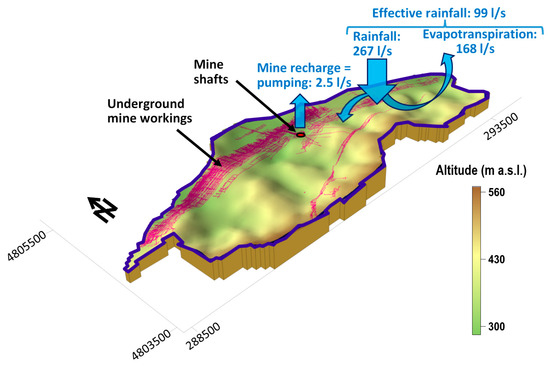 In terms of climate, the average rainfall in Lieres is 950 mm year−1, and the average annual temperature is 13.8 °C. The Thornthwaite evapotranspiration is estimated in 63% of the precipitation, so the annual effective rainfall is about 350 mm. The basin that receives the recharge of the Lieres underground reservoir covers 8.8 km2 (Figure 4). Supposing that the pumped flow equals the recharge within that basin, only 2.5% of the effective rainfall infiltrates into the mine. The total capacity of the mining reservoir (around 7 Mm3) would have to be filled with water to achieve complete flooding, but before that, pumping will probably have to be resumed to keep a safe flood level.