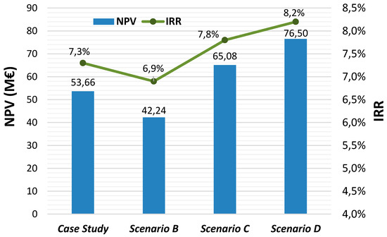 The net present value (NPV) and the internal rate of return (IRR) were obtained for different scenarios depending on the electricity prices in the day-ahead and ancillary services markets. For each scenario, different energy prices were considered, both for the UPHS plant and for the wind farm, and the calculated revenues of the hybrid system were calculated (Table 5). Likewise, the NPV and the IRR were recalculated keeping the rest of the variables constant (Figure 6). It is observed that profitability increases when the price of energy also increases. This effect is more notable in the profitability of the UPHS plant, since it is the one that supplies the most energy. The wind farm revenues are not so affected by market conditions since wind energy will only be used when the UPHS plant operates in consumption mode for pumping.