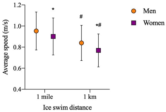 Ice Mile and Ice Km swimming performance (average swimming speed) by sex and distance. *: significant difference between sex. #: significant difference between distance.