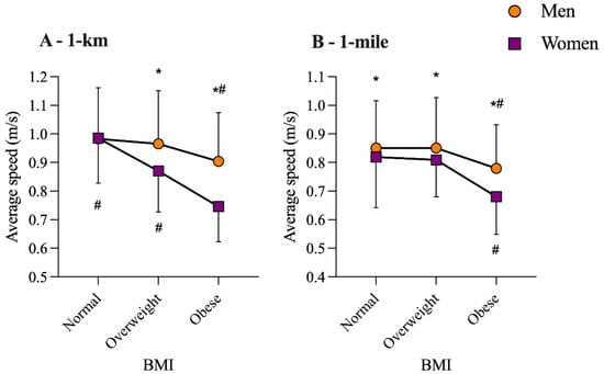 The model with sex and BMI categories in Ice Km showed significant effect for sex (F = 30.3; p < 0.001; pη2 = 0.044) and BMI (F = 31.9; p < 0.001; pη2 = 0.089). Similarly, for the Ice Km, we found a significant effect for sex (F = 11.1; p = 0.001; pη2 = 0.027) and BMI (F = 16.8; p < 0.001; pη2 = 0.078). Post-hoc analyses showed that men were faster in all BMI categories but the normal weight in Ice Km. Furthermore, subjects in the obese BMI category were slower regardless of their sex (Figure 2).