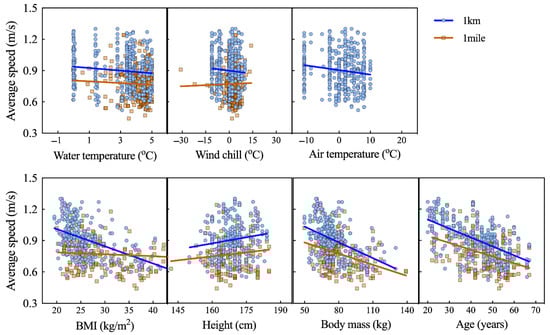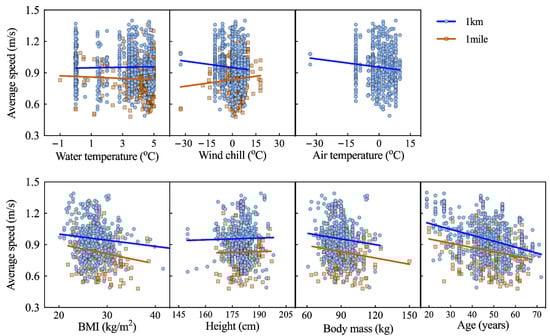Association analyses for men showed that performance was negatively correlated with age (Ice Km: r = −0.343; p < 0.001; Ice Mile: r = −0.237; p < 0.001). Significant and negative correlations were found between performance and body mass (Ice Km: r = −0.105; p = 0.036; Ice Mile: r = −0.143; p = 0.040) and BMI (Ice Km: r = −0.118; p = 0.018; Ice Mile: r = −0.175; p = 0.012). Men’s performance in Ice Km showed a weak correlation with air temperature (r = −0.09; p = 0.029), but it was not correlated with water temperature, wind chill, and body height (p > 0.05) (Figure 3).